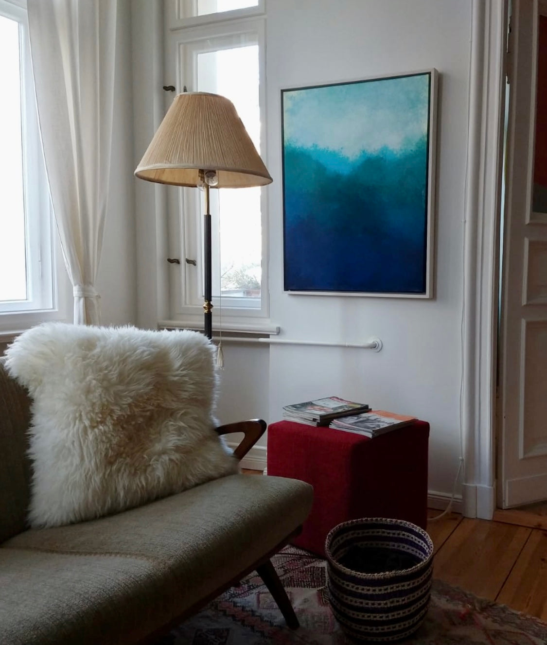 "This was a dream come true art commission. First art commission I’ve ever ordered btw. I wanted Elisa to come to our home in Finland and make her paint a whole wall, but as we were renting. Elisa said “YES!”. Well.. “maybe not the whole wall... but we can definitely make something big and beautiful! And we can make it portable too. So that if you move somewhere again you can take it with you.” After hearing this I knew something magical would come out. Knowing her work and knowing that she knows what I like I had 100% faith in this project.I had a vision in my head about the perfect colour combination and this is how I explained it to Elisa: “Imagine you’ve just fallen from your surfboard and you’re floating under the surface looking up towards the sky and you see this beautiful combination of sparkling blue and turquoise tropical water..” And. Elisa. Delivered. Spot on. Pure perfection. Blue is a happy colour."
