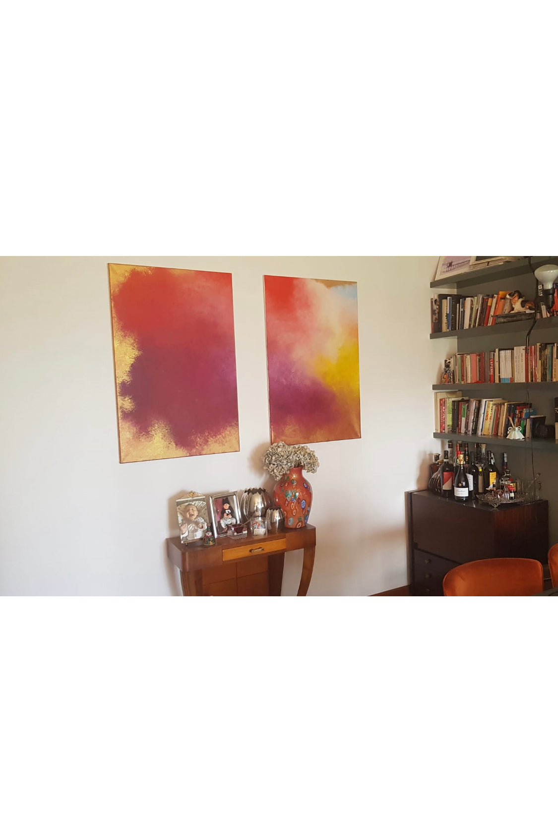 "I commissioned a big work to Elisa because I have admired her style for years, the care she puts in her work and the uniqueness of her pieces. So I thought one of her pieces would be the ideal gift for my fiancée's birthday. Elisa asked me to send pictures of the room and gave me valuable advice on the size of the canvases, the technique and the perfect colours/shades (analysing the light present in the rooms at different times of the day and the colours and style of the furniture), always respecting my requests, with a constructive and competent spirit, very professional! Thanks to the photos that Elisa sent during the process, I was able to appreciate the different phases of the work and give some feedback. At the end of the work, I received a Photoshopped preview of the tryptic hanging in my living room, striking! She also shared with me the hyper-lapse video of the execution of the work, and it was amazing and made me understand the enormous amount of work, the precision and the patience needed to get to the final result. My fiancée was speechless when she opened the package and we are so happy with our custom piece! Thank you Elisa"